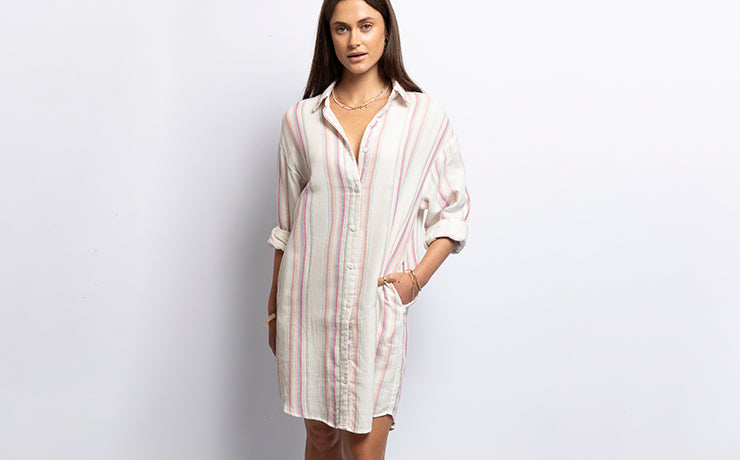 Relaxed and effortlessly chic, this striped shirt dress combines soft cotton with a hint of lurex for a subtle, sunlit shimmer. Its breezy silhouette and pastel tones capture the essence of Riviera style. It is perfect for warm days or seaside escapes.