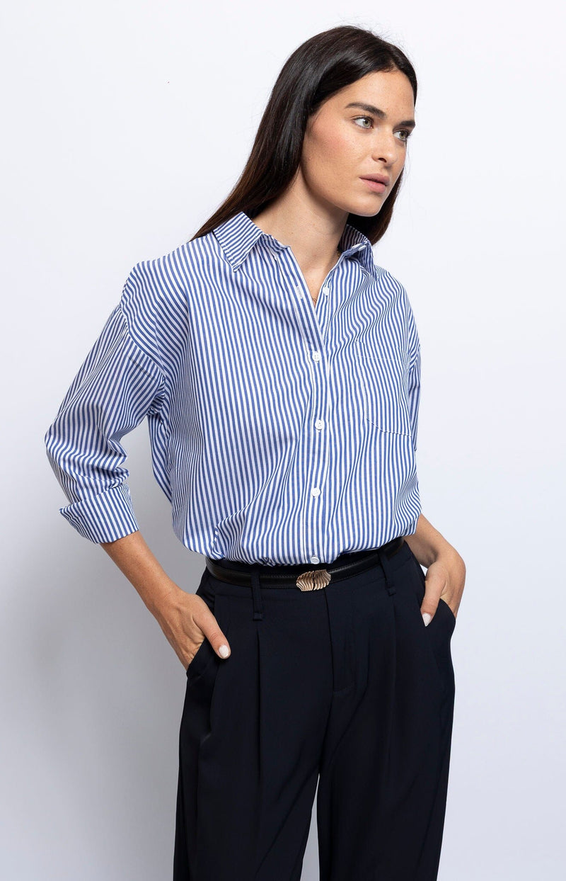 A timeless wardrobe essential, this classic button-down shirt features crisp blue and white stripes and a relaxed silhouette that pairs perfectly with tailored trousers or tucked into denim for effortless chic.
